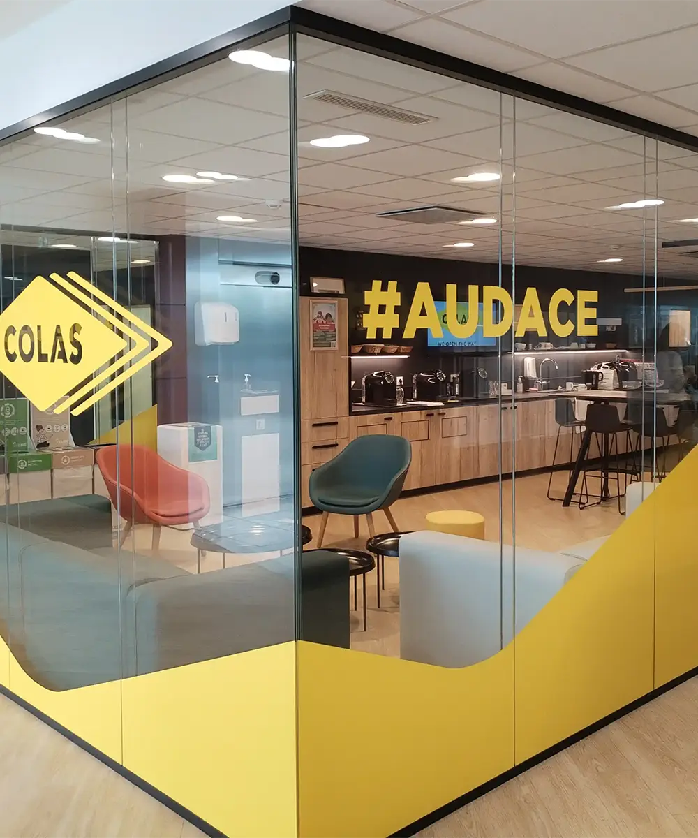 Dépoli, sablé, motifs géométriques, effets matières ou bandes discrètes : chaque projet peut être conçu sur mesure afin de respecter la charte graphique de l’entreprise et l’architecture des lieux.